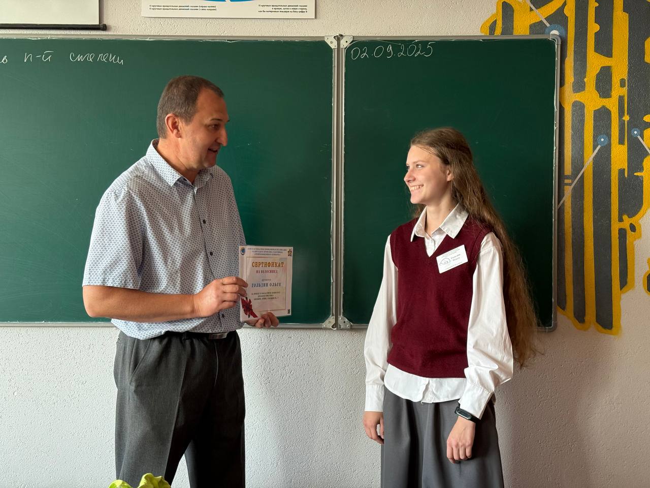 Александр Юрчик поздравил Ольгу с заслуженной победой, вручил сертификат на велосипед и пожелал успехов в новом учебном году.