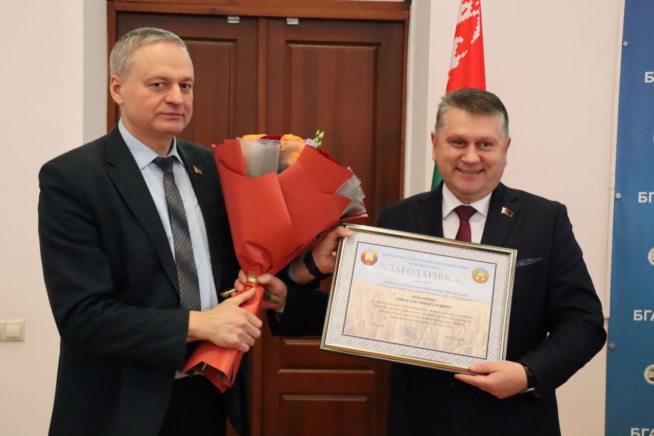 Также ректор получил Почетную грамоту Минского областного комитета Белорусского профсоюза работников агропромышленного комплекса за развитие социального партнерства. Ее вручила председатель Минской областной профсоюзной организации Белорусского профсоюза работников АПК Оксана Бельская.