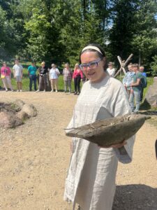 В Суле гостей радушно встретили у ворот парка-музея. Затем группа с сопровождением отправилась к центральной площади, откуда и началась экскурсия. На стоянке древнего человека участники поездки познакомились с бытом наших предков, проживавших здесь много тысячелетий назад. Узнали, какие помещения для жилья они использовали, как добывали и обрабатывали пищу, какую одежду носили. Увидели древнейшие рукотворные металитические сооружения – кромлех, которые использовались для проведения различных ритуалов. Прошли древнеславянский обряд очищения огнем, побывали в оружейной кузнице, где каждый желающий смог выковать себе амулет на счастье.