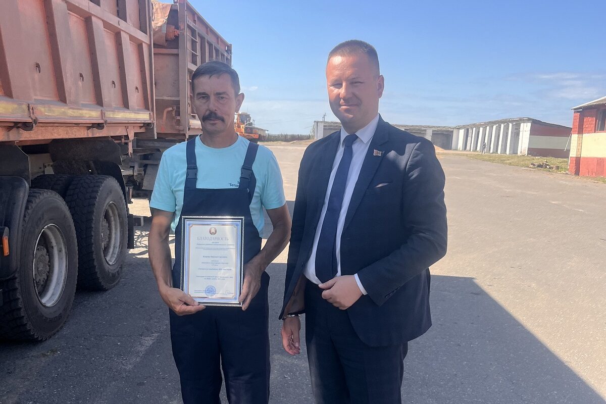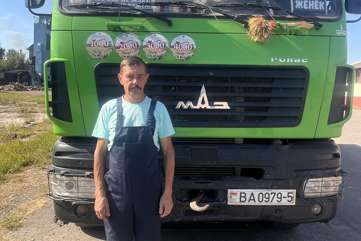 Сегодня слова благодарности принимал водитель ОАО «Речень» Николай Кукреш, который перевёз четыре тысячи тонн зерна.
