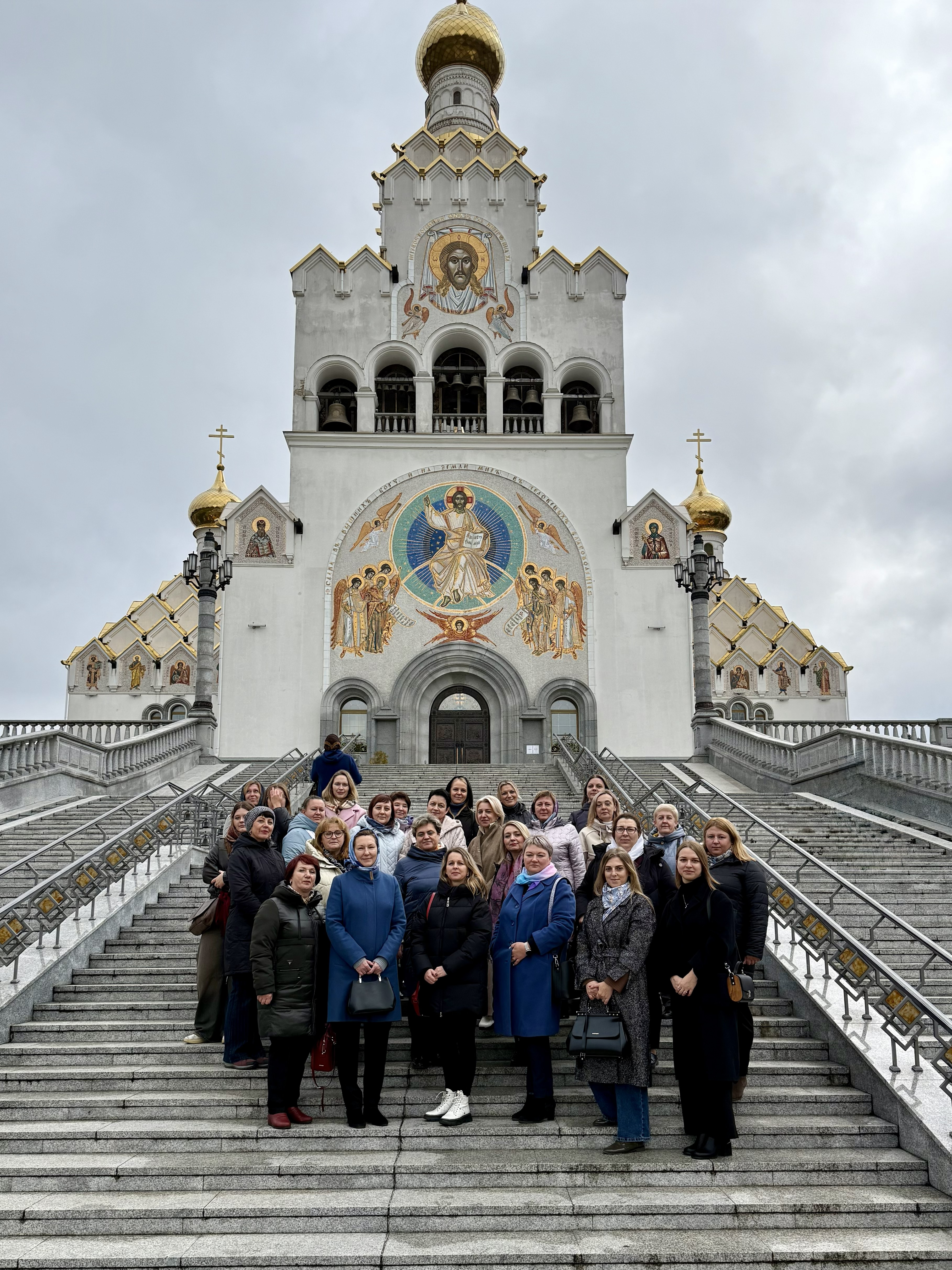 Экскурсия началась в Храме-памятнике Всех Святых. Это белоснежное здание, напоминающее древние шатровые православные храмы, поражает своей красотой. Участники посетили крипту храма, где хранится земля с мест захоронения воинов. Это место символизирует память и уважение к тем, кто отдал свою жизнь за Родину.