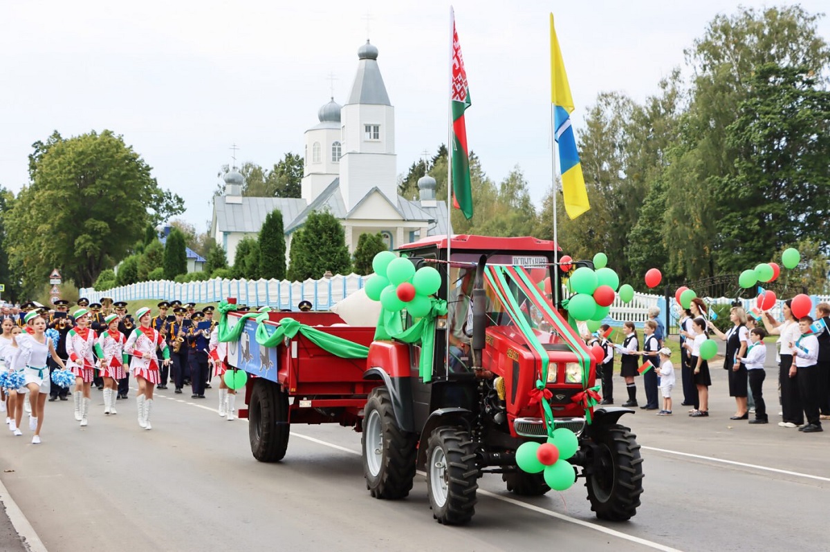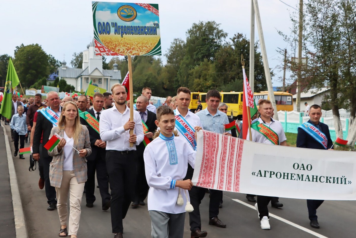 В праздничной колонне, которая прошла по главной улице обновлённого агрогородка, вместе с руководителями и передовиками сельскохозяйственного производства шли представители местных органов власти, председатели первичных профсоюзных организаций, молодые специалисты и гости праздника.